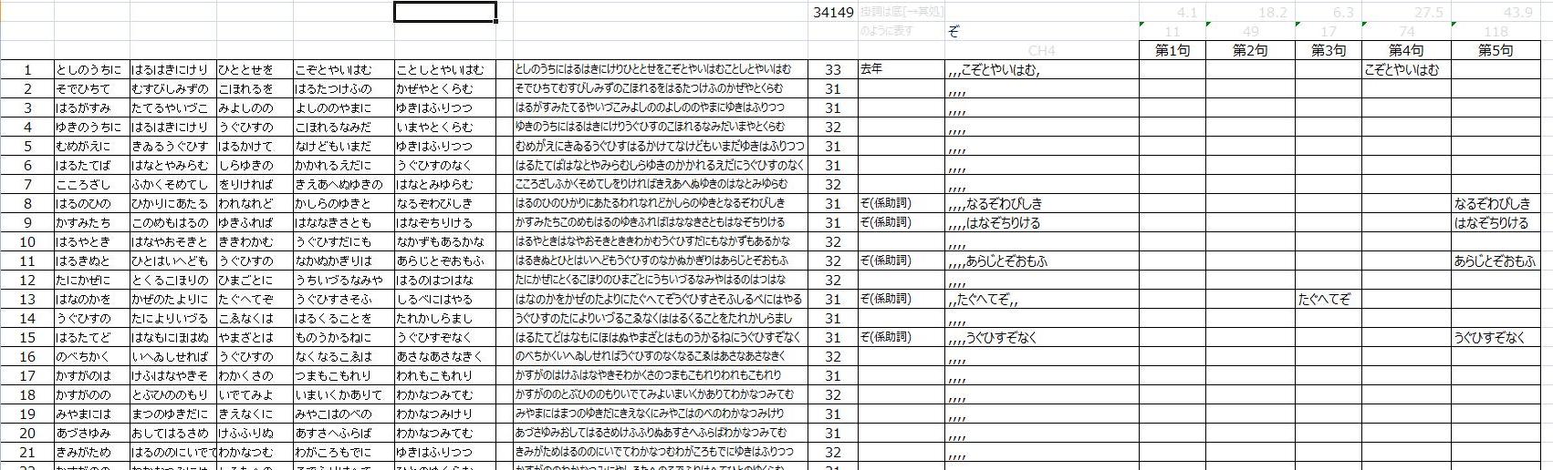 巻数と歌番号は重要です。元のテキストにある形態からコピーしておきます。巻数と歌番号は別々のセルに入るようにした方が融通が利いて便利でしょう。