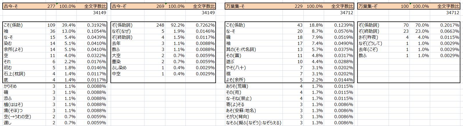 例を一つ示します。"そ"、"ぞ"について、古今集(短歌のみ)と万葉集(前述の7巻の短歌のみ)を調査したもので、それぞれの出現頻度トップ10をまとめたものです。