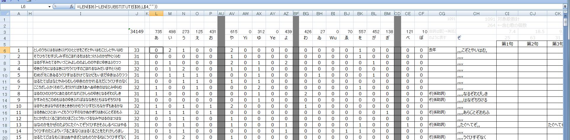 参考までに、1番歌に対する"あ"の出現回数をチェックする式が左上に表示してあります。