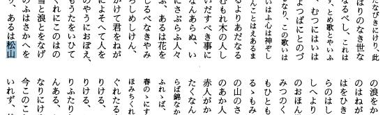 脚注でも、行間の泣き別れが検索できています。「思ふ」を検索した例です。段組みの構造の認識と同じように、本文と脚注の二段構造を認識していることが分かります。