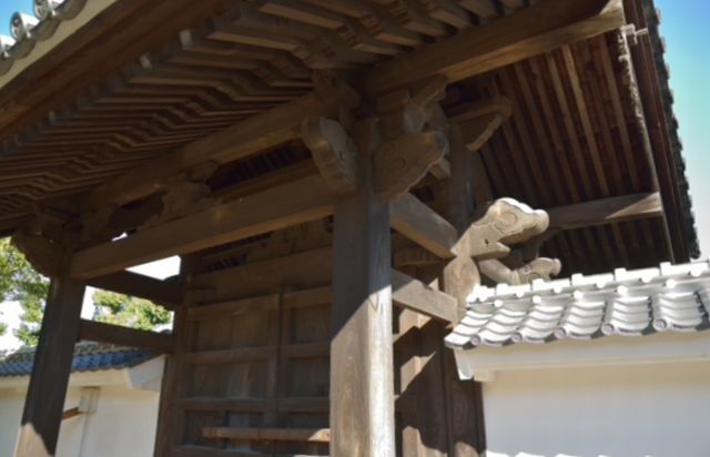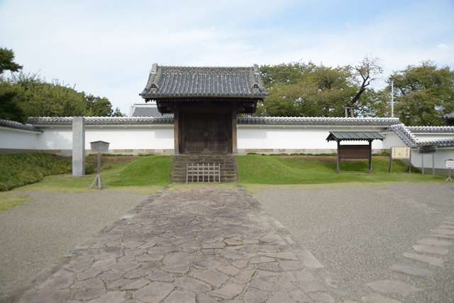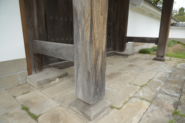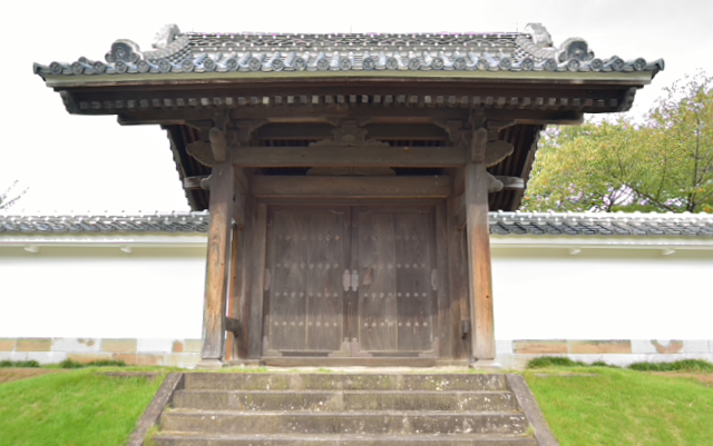 重要文化財に指定されているのは、中央の正門と、それから左右に直線状に伸びる塀です。塀は両方向ともにさらに伸びていますが、正門と一直線に伸びた各一区間が重要文化財の対象です。