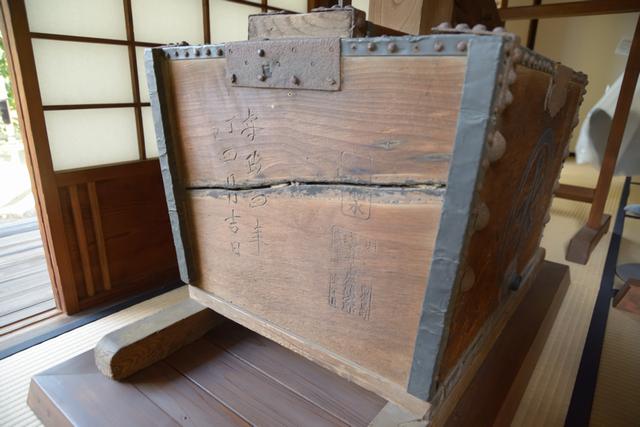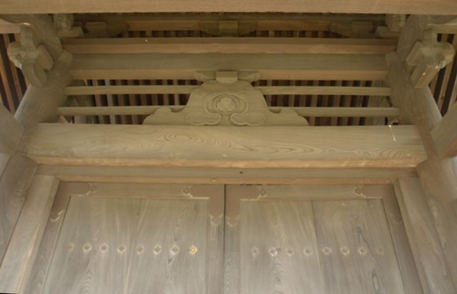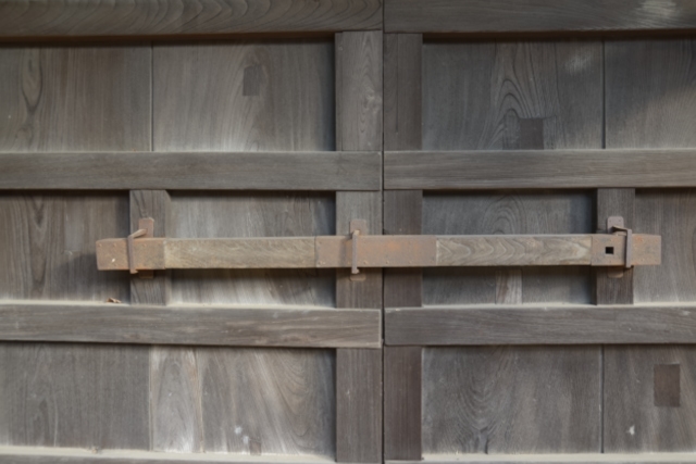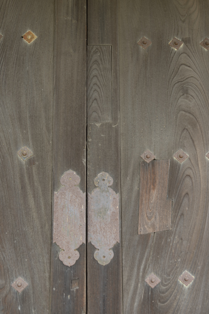 修理跡がたくさん見られます。大きなものは右扉中段や右扉の枠の上部、小さなものは右扉上部の水平にある3個の金具の中央のものの右わき、左扉の中段金具のすぐ右下、左扉の枠の下部。色が地味で判別しにくいかもしれません。