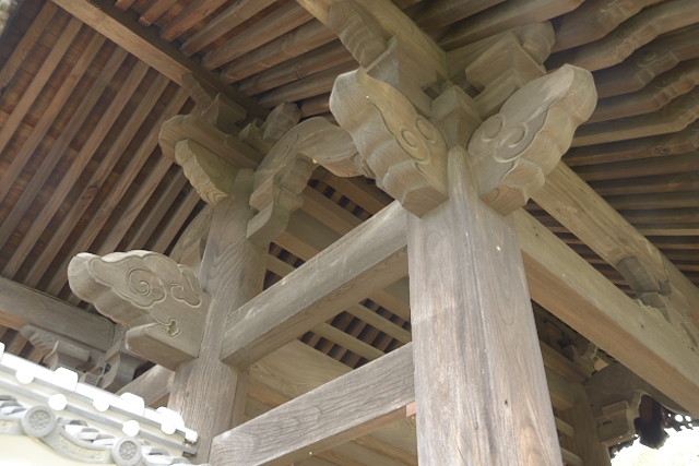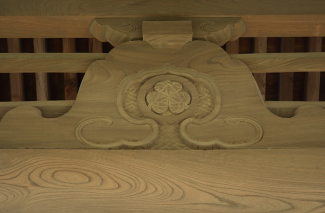 木鼻や本柱と控柱をつなぐ海老虹梁など、寺院と同様です。色彩がありませんが、おそらく創建当時からなかったのでしょうね。寺院の場合は見る人を圧倒するような色彩が施され、年月とともに風化して色があせた、という場合が多いのですが、そうではなさそうです。