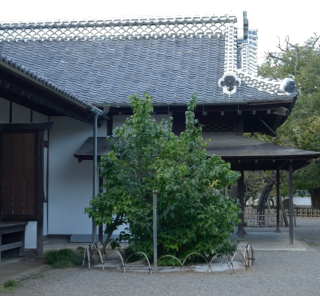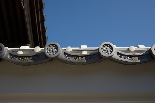 軒先の瓦の先端(これを瓦当(がとう)というようです)の模様ですが、門の屋根では三つ葉葵ですが、塀の屋根では三つ巴の周囲に8個の小円が配置した模様です。