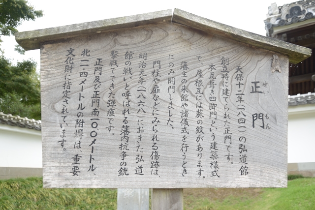 重要文化財の観点からみると、弘道館では、正庁、至善堂、正門附塀の3点です。現実に見学する場合、たいていは正門、正庁、至善堂の順で巡ることになります。