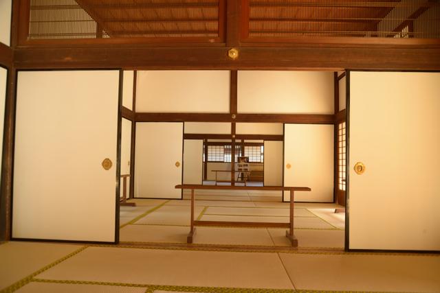 一番外側は縁側でしょうか。外に雨戸があります。障子の内側が廊下でしょうか。正庁では雨戸がありませんでした。逆に正庁の方が雨の時には大丈夫なんだろうか、と気になります。至善堂は藩主が宿泊することがあり、正庁は仕事をするところで、そのような違いが出ているような気がします。明治元年には徳川慶喜はここで謹慎生活を送った、とされているように、こちらは生活の場所でもあります。
