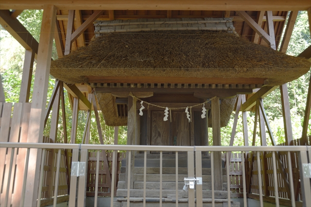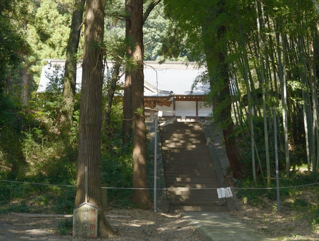 参道の終わりはロープが張られて、目の前に見える拝殿に進めません。「ススメバチ注意」と書かれています。これは困った。一人での撮影で襲われてはまずい。左手に回り込むと拝殿まで行けるように見えました。