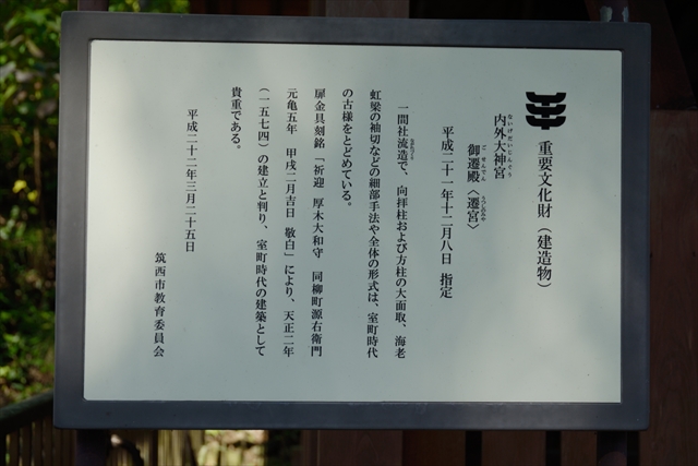 私にとって、茨城県内の重要文化財指定建造物の写真としては、寺院シリーズを終え、神社シリーズの最初になります。神明造の内宮外宮は延宝7年(1679)作られたとされます。日本最古の神明造は仁科神明宮(1636年)とされます(*1)ので、日本最古に近い建造物のようです。